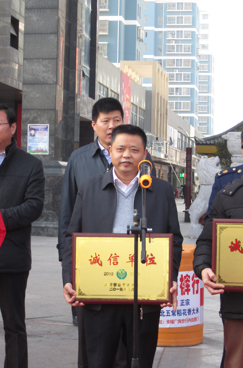 3月15日,洪泽县工商局在幸福广场开展3•15消费维权广场宣传活动,县人大常委会副主任黄河、副县长张培刚、县政协副主席陈炳峰出席活动,县工商局、药监局、卫生局等20多家单位设立咨询台,向广大消费者发放宣传材料,接受消费者权益保护法法规咨询,讲解和传授商品真假识别知识,并现场接受消费者投诉。 活动中,还为十多家消费者诚信单位授牌。其中,我公司获得“淮安市诚信单位”这一荣誉。